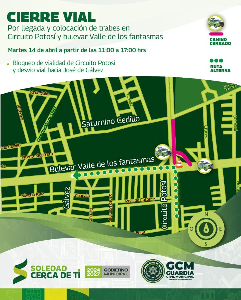 Soledad de Graciano Sánchez, S.L.P.- La Dirección de Seguridad Vial y Movilidad de Soledad de Graciano Sánchez informa a la ciudadanía que, derivado de los trabajos de construcción del puente elevado, se realizará la suspensión de la circulación en Bulevar Valle de los Fantasmas y Circuito Potosí Oriente, con dirección a La Virgen, quedando cerrada dicha arteria, la circulación será dirigida hacia José de Gálvez con dirección hacia el distribuidor Juárez.