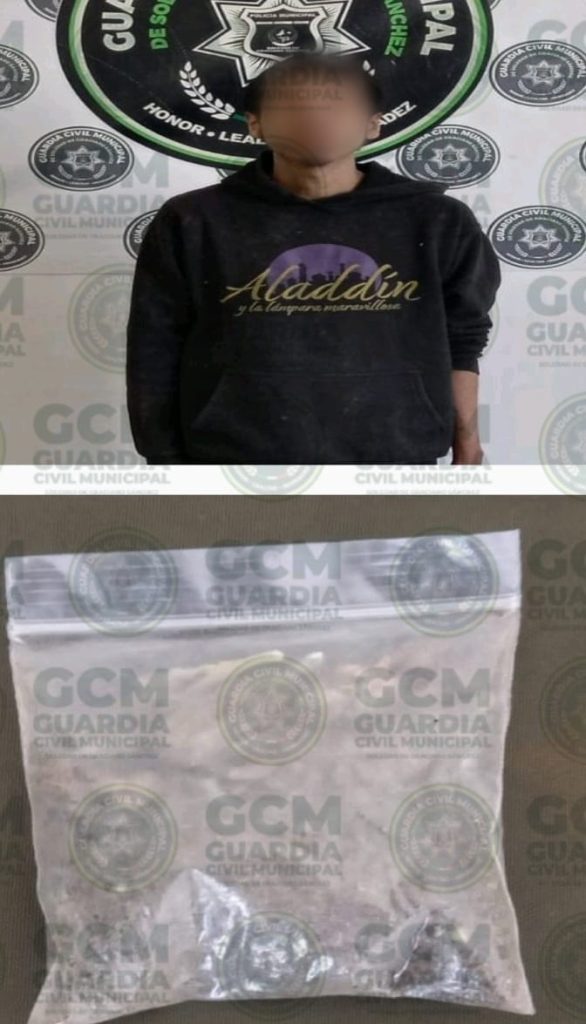 Brian “N” de 22 años fue detectado en la calle Blas Escontría, en Cabecera Municipal, cuando incurría en faltas al Bando de Policía y Gobierno, localizándole un envoltorio con piedra granulada semejante a la metanfetamina llamada “cristal”. Por último, en la avenida San Lorenzo, en la colonia San José Segunda Sección, oficiales municipales tuvieron contacto con quien dijo llamarse Joel “N” de 28 años, quien cometía actos contra la moral, a quien le descubrieron una bolsa con hierba seca con las características de la marihuana.